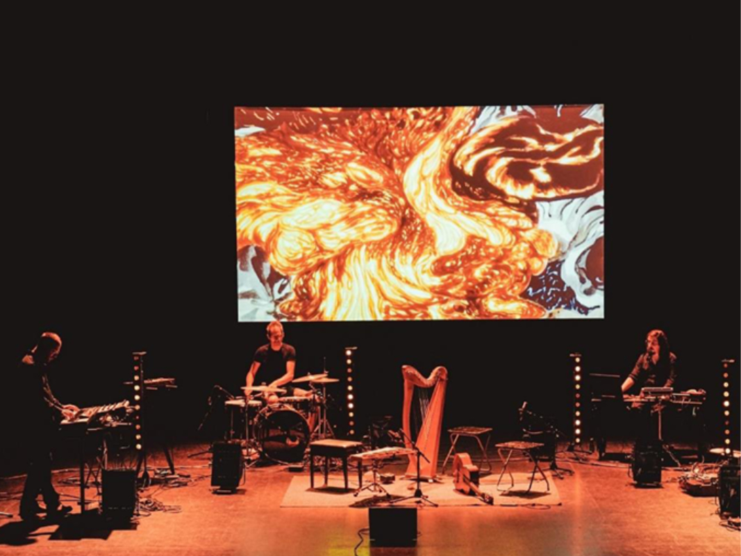 BD Concert interprété par l’Ensemble Drift : Sol Hess (guitares, basse), Jérôme D’Aviau (batterie, clavier, glockenspiel), Frédéric Canaux (clavier, basse, harpe celtique, boîtes à musique et componiums, mélodies), Marie Savignat (régisseuse son).